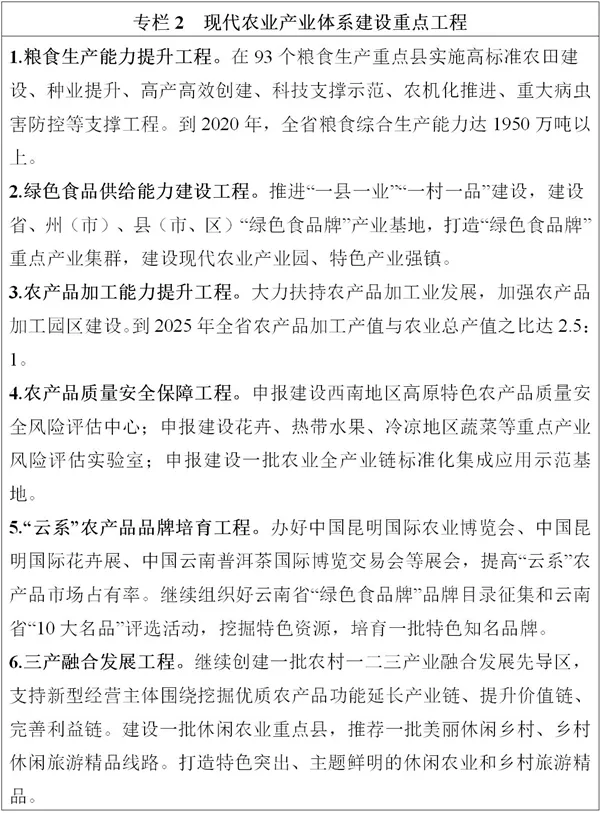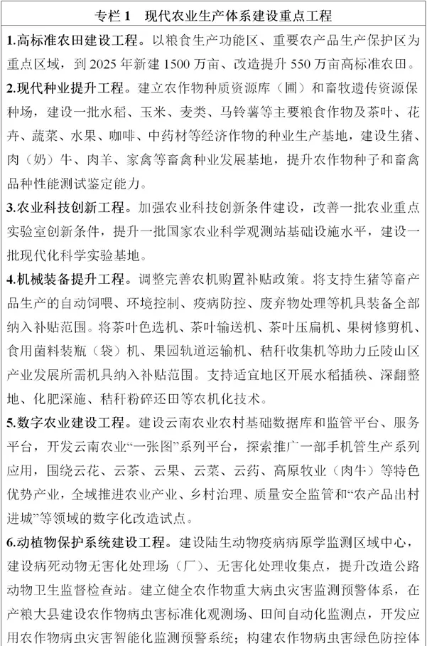 全力穩(wěn)定糧食綜合產(chǎn)能。堅持藏糧于地、藏糧于技,樹立大食物安全觀,立足糧食供需平衡區(qū)的基本省情,確保糧食種植面積穩(wěn)定在6250萬畝左右,在93個稻谷、玉米、小麥等糧食生產(chǎn)重點縣(市、區(qū))集中連片建設(shè)糧食生產(chǎn)核心區(qū),打造一批綠色高質(zhì)高效示范基地。在“九湖兩江”流域大力推廣“水稻+”綜合種養(yǎng)模式,探索水稻田保護(hù)和農(nóng)業(yè)綠色生態(tài)發(fā)展路徑。努力挖掘糧食生產(chǎn)潛能,大力發(fā)展晚秋糧食生產(chǎn)和冬季農(nóng)業(yè)開發(fā),擴大小雜糧、小雜豆、馬鈴薯、鮮食玉米等糧食作物面積。到2025年,全省糧食產(chǎn)量達(dá)1950萬噸??v深推進(jìn)特色產(chǎn)業(yè)發(fā)展。圍繞糧食、茶葉、花卉、水果、蔬菜、堅果、咖啡、中藥材、生豬、肉牛等“綠色食品牌”重點產(chǎn)業(yè),深入實施“一二三”行動,打造“一縣一業(yè)”,抓住種子和電商兩端,推進(jìn)設(shè)施化、有機化、數(shù)字化發(fā)展。到2025年,“綠色食品牌”重點產(chǎn)業(yè)綜合產(chǎn)值實現(xiàn)翻番。穩(wěn)定糖料蔗產(chǎn)能。鞏固臨滄市、普洱市、德宏州、西雙版納州等適宜區(qū)種植面積,加快中低產(chǎn)蔗田改造,加強適宜丘陵山地機具的研發(fā)和推廣應(yīng)用,到2025年,全省糖料蔗產(chǎn)量穩(wěn)定在1600萬噸左右。促進(jìn)橡膠產(chǎn)業(yè)轉(zhuǎn)型升級。擴面增產(chǎn)、強質(zhì)提特、輻射全國,西雙版納州、普洱市等地區(qū)加快發(fā)展特種膠園,因地制宜發(fā)展生態(tài)膠園,打造國內(nèi)天然橡膠生產(chǎn)供應(yīng)主基地。加快綠色生態(tài)漁業(yè)發(fā)展。