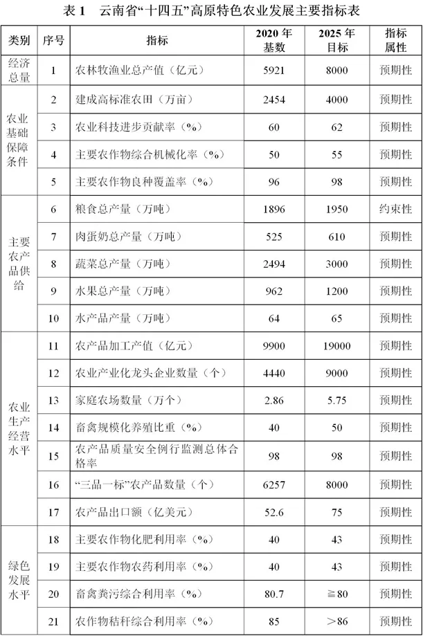 “十四五”時期,云南高原特色農(nóng)業(yè)發(fā)展的總體目標(biāo)是:在確保糧食等主要農(nóng)產(chǎn)品有效供給基礎(chǔ)上,以做特“綠色食品牌”為抓手,深入推進(jìn)農(nóng)業(yè)供給側(cè)結(jié)構(gòu)性改革,加快農(nóng)業(yè)產(chǎn)業(yè)轉(zhuǎn)型升級,不斷提升農(nóng)業(yè)現(xiàn)代化水平,促進(jìn)農(nóng)民收入持續(xù)穩(wěn)定增長,實現(xiàn)一定水平的農(nóng)業(yè)高質(zhì)高效,農(nóng)民富裕富足。
