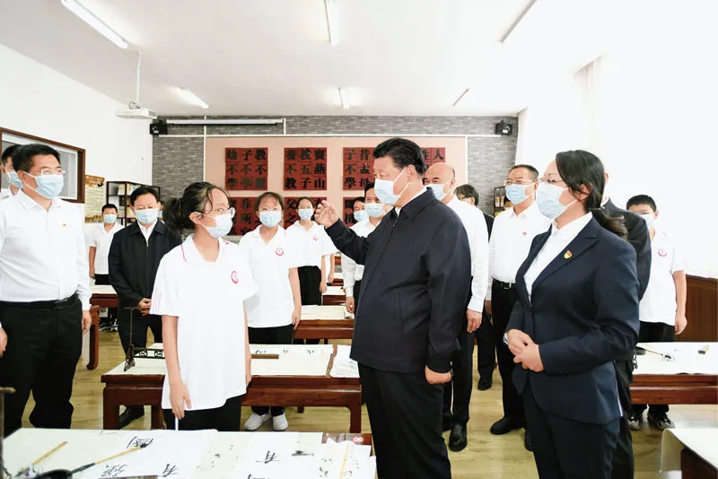 △ 2021年9月13日至14日,中共中央總書記、國家主席、中央軍委主席習(xí)近平在陜西省榆林市考察。這是14日上午,習(xí)近平在綏德實驗中學(xué)考察時,同正在練習(xí)書法的學(xué)生親切交流。新華社記者 李學(xué)仁/攝