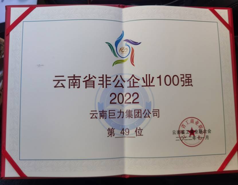 2022年11月15日,云南省工商業(yè)聯(lián)合會(huì)(總商會(huì))在云南海埂會(huì)堂舉行2022年“云南省非公企業(yè)100強(qiáng)”發(fā)布會(huì)。云南巨力集團(tuán)董事長(zhǎng)王國(guó)新出席發(fā)布會(huì)活動(dòng)。云南巨力集團(tuán)連續(xù)六年榮列“云南省非公企業(yè)100強(qiáng)”榮譽(yù)榜單,在云南省2022年非公企業(yè)100強(qiáng)中位列49位,比上年度上升一位。