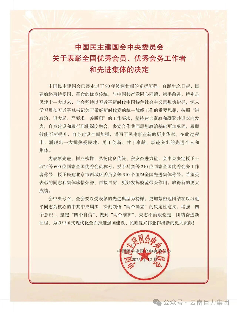八秩同心筑偉業(yè),砥礪奮進譜新篇。2025年12月17日,慶祝中國民主建國會成立80周年大會在京隆重召開,大會對民建全國優(yōu)秀會員、會務工作者及先進集體進行表彰。云南民建喜獲豐收,14名會員、8個組織榮獲民建全國優(yōu)秀會員、優(yōu)秀會務工作者、先進集體表彰。云南巨力集團董事長、民建云南省委常委、直屬園區(qū)基層委主委王國新先生榮登“民建全國優(yōu)秀會員”光榮榜!這一榮譽不僅是對他個人的高度肯定,更是對他多年來在企業(yè)發(fā)展、參政議政和社會責任履行等方面卓越貢獻的認可。