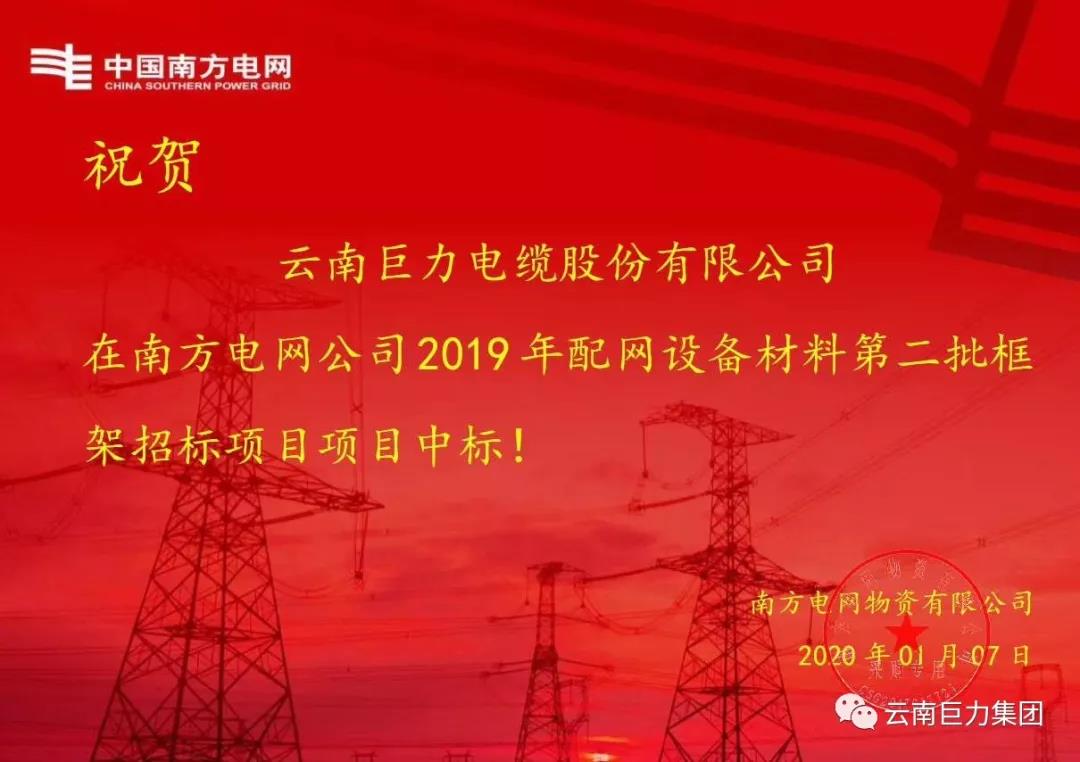 祝賀巨力電纜中標(biāo)南方電網(wǎng)第二批框架招標(biāo)項(xiàng)目